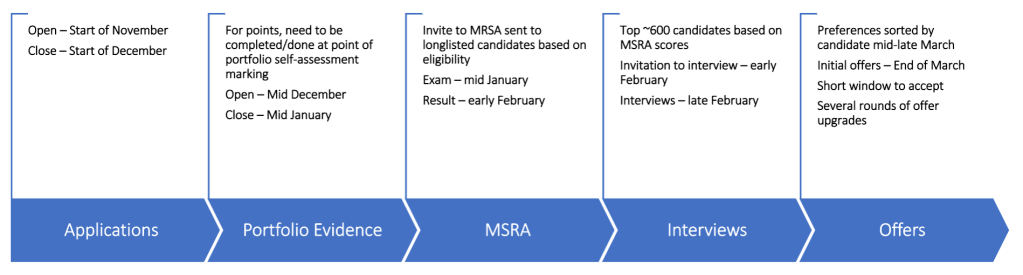 The MSRA is sat in ~January/February. The scores from the MSRA are used to determine who will receive an invitation to interview (top ~600). Most recent interviews have been conducted online via Teams at the end of February/start of March, however this may revert back at some point to face-to-face interviews.